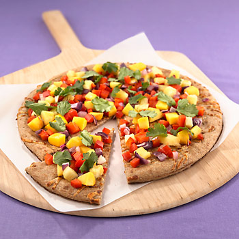 对于传统的奶酪披萨来说,水果披萨是异类。把切碎的彩椒、0.5杯洋葱粒、0.5杯芒果粒、0.5杯菠萝粒混合在一起,再添加1勺柠檬汁和0.5勺新鲜的香菜,最后都放到用全麦做的12寸披萨面皮里。在218℃烤箱里烘烤到配品变热、底层披萨皮变成棕色,5 ~10分钟即可搞定。