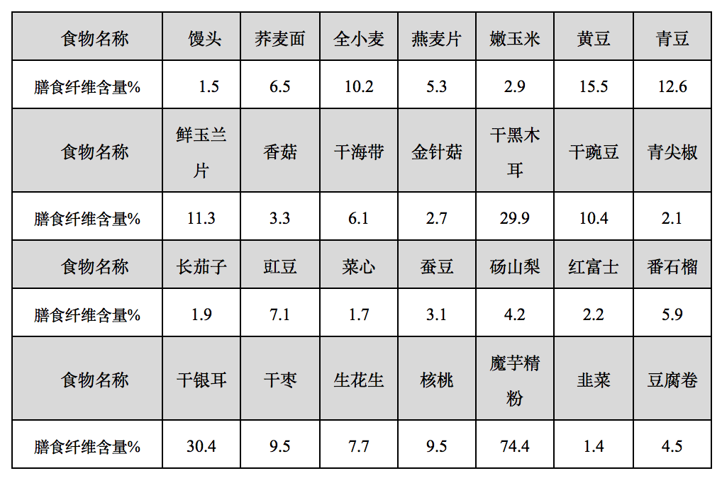 表1中,我们展示小部分膳食纤维相对丰富的食物(数据来源:中国食物成分表2010版)。
