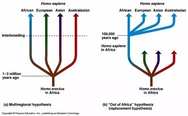 左边这张图表明多地区起源说:各地的直立人在各地演化成了智人。右边这张图是单起源说,走出非洲说:来源于一支非洲的直立人演化成了智人,而其他的直立人已经消失掉了。通过分析发现,直立人中的尼安德特人基因很少部分渗入智人基因组中,这个事实其实已经基本可以认定第二种学说是对的。