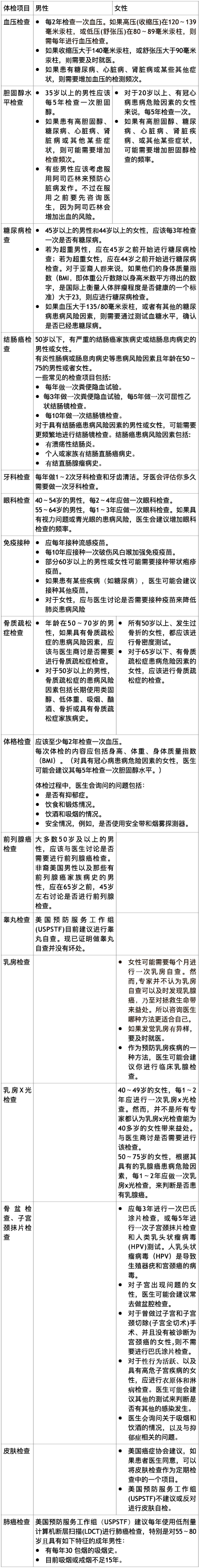 在某些情况下,应及时、按时去体检。下述表格中的内容是对40~64岁成年男性和女性的体检建议。