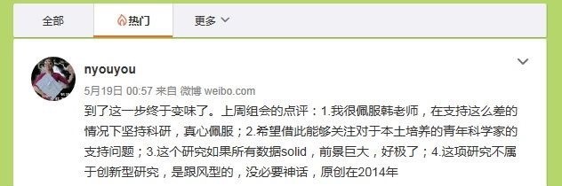 5月19日,一位清华教授发表评论,表示佩服韩的工作,但韩并非原创,没必要神化。网民纷纷起哄,两种观点对峙,但舆论几乎一边倒地指责一线科研机构,认为其白白占有大量资源而不作为,却让普通院校做出了一流的成果。