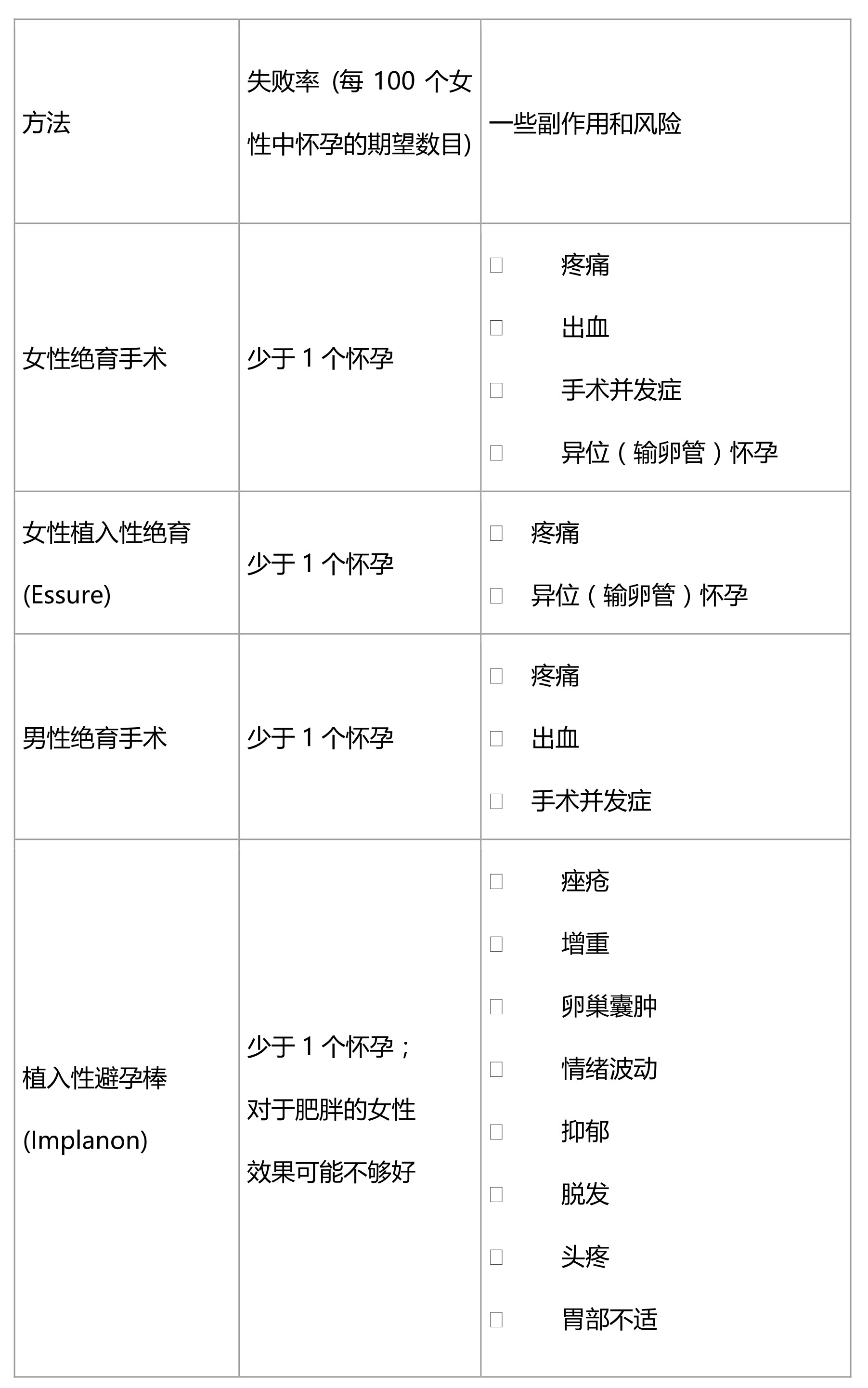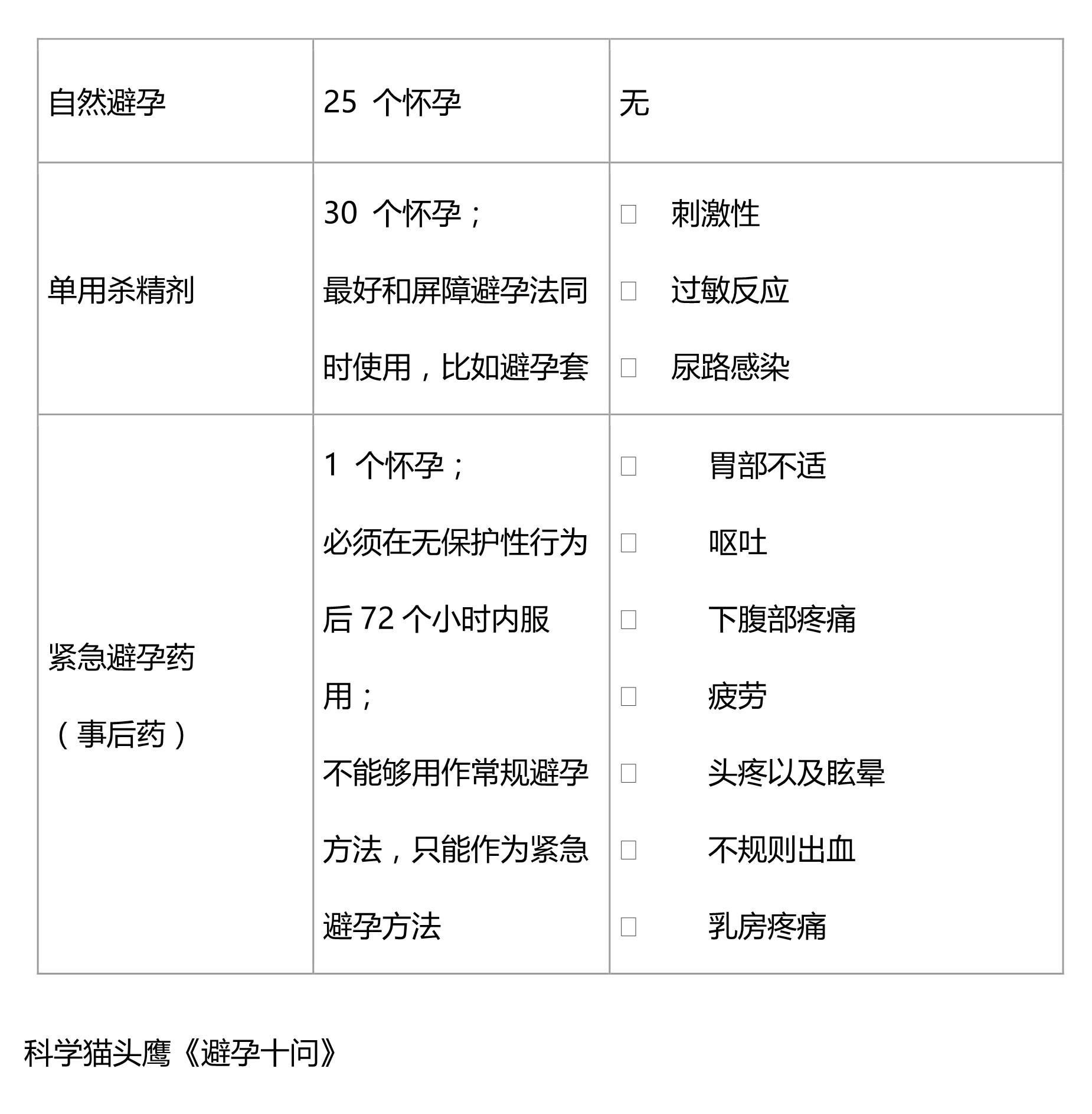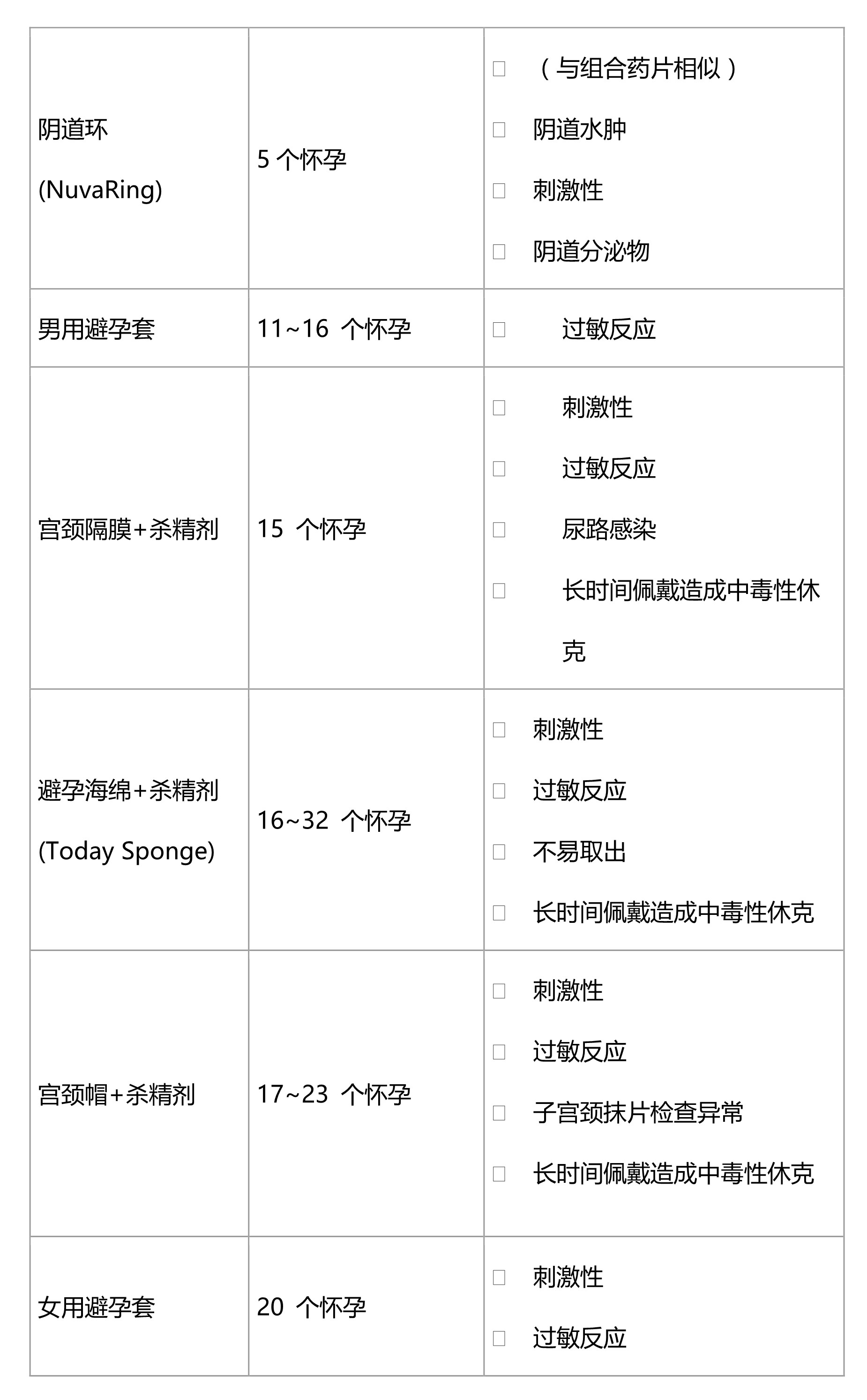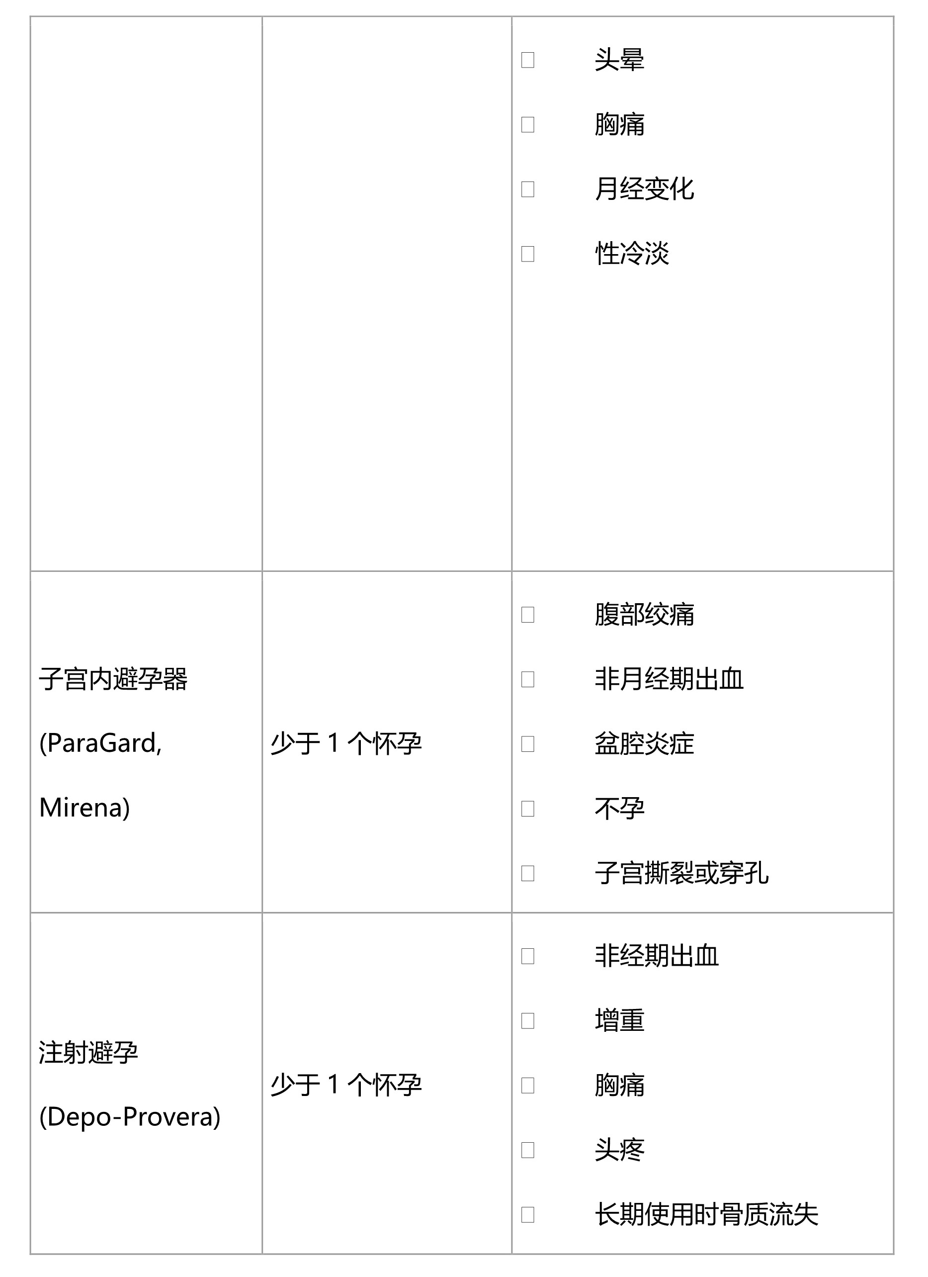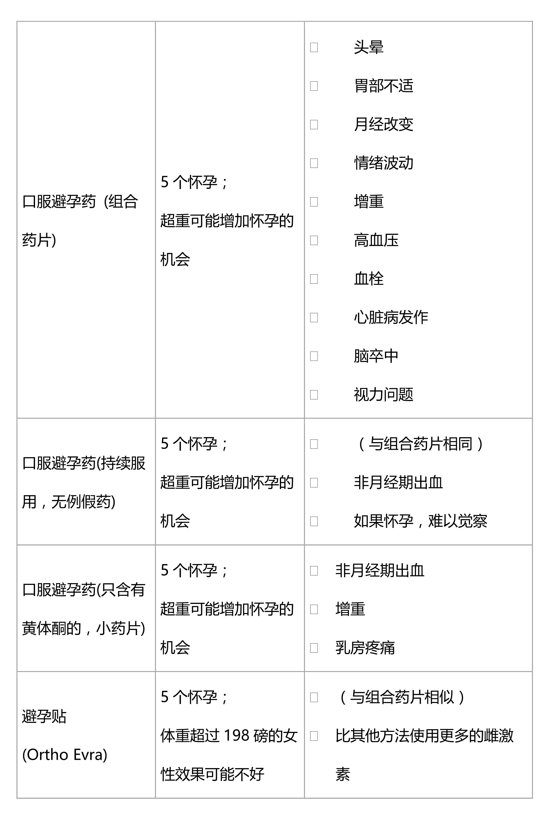 下面是部分避孕方法的列表,包括了每种方法的失败率和可能的副作用。