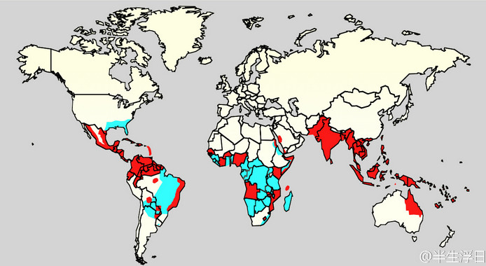 蓝色 表示该地区有埃及斑蚊,但没有登革热流行