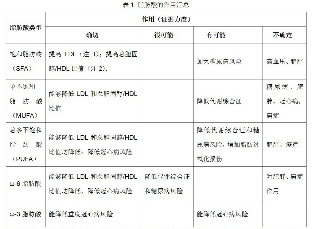 对多不饱和脂肪酸的作用研究多集中在ω-3,ω-6对冠心病等心血管疾病、肥胖、糖尿病的影响,科学家经过多年的研究,取得了一致的结论。下表1,列出了2010联合国粮农组织出版的《脂肪、脂肪酸与人类营养》的关于脂肪酸的作用总结(总结了最近多年的研究结果)。