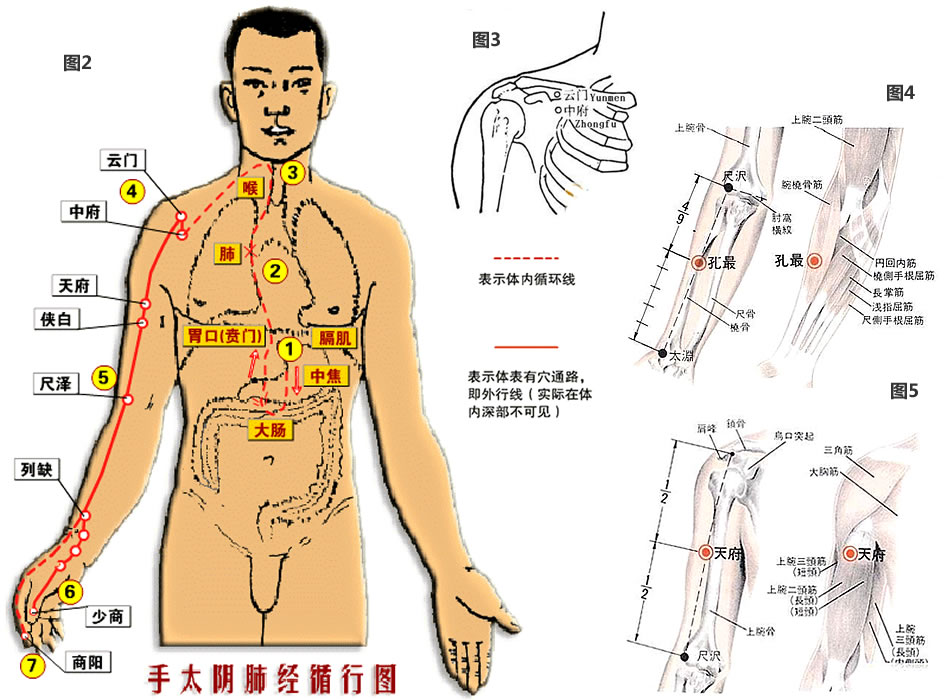 据《灵枢.灵脉》,手太阴肺经起始于中焦(胃脘部),向下联络大肠,回过来沿着胃上口,穿过膈肌,属于肺脏。从肺系(气管、喉咙部)横出腋下(中府、云门),下循上臂内侧,走手少阴,手厥阴经之前(天府、侠白),下向肘中(尺泽),沿前臂内侧桡骨边缘(孔最),进入寸口即桡动脉搏动处(经渠、太渊),上向大鱼际部,沿边际(鱼际),出拇指的末端(少商)。其支脉从腕后(列缺)走向食指桡侧,出其末端,接手阳明大肠经。古人将这一路线描述的何等明白,若是不可见,岂不活见鬼。其解剖关系如图2、3、4、5、6所示。