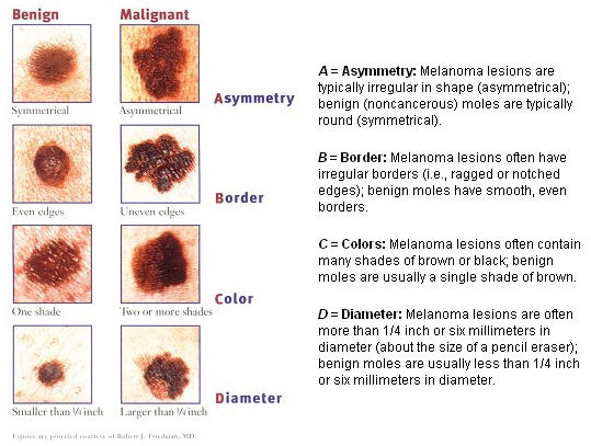 所以喜欢户外暴晒,或者户外劳作的人,要经常注意观察自己的皮肤,女性尤其注意双腿,男性尤其注意背部。黑色素瘤的特征专家按照英文的习惯给出了ABCDE,便于记忆翻译如下: