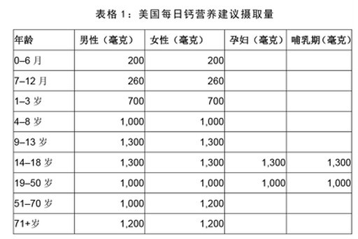 但由于各个国家和地区生活水平不同以及饮食习惯的差异,每人每天从食物中摄入的钙量差别很大,在欧美等发达国家,平均每人每天摄取850毫克,而在很多发展中国家只有300多毫克。钙摄取不足是很多发展中国家面临的一个严重的健康问题。各个国家和地区建议的每天钙摄取量不尽相同,表格1列出了美国的每日钙营养建议摄取量。