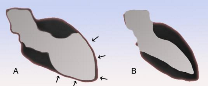 因病人心脏的交感神经受体在左心室基部与心尖部位的比例不一樣,当患者极度伤心、遭逢压力应激、惊吓或疼痛時,就会造成心尖未收縮,但心室基部强力收缩如气球的情形(如下图A心尖呈球形;B为心室正常收缩)。