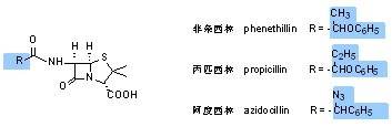 先图解一下,上图左是青霉素基本结构,由A和B两部分组成,“B”部分就是“β-内酰胺”,“A”部分是氢化噻唑环,这个结构很不稳定,容易重排、分解、聚合,当β-内酰胺脱离氢化噻唑环后,就可与特异性IgE结合,诱发“速发型变态反应”;上图右是头孢菌素类药结构,其“B”部分与图左的“B”部分都是“β-内酰胺”,区别是图右的“A”部分是“氢化噻嗪环”,这个组合结构稳定,不易分解、聚合。下图就是半合成青霉素,与PG相比,侧链改变了,结果是令半合成青霉素比PG的结构更稳定了,不易分解,耐酸耐酶。
