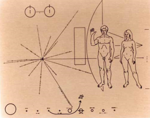 「1972年发射的美国飞船“先锋者10号”携带着一张镀金铝盘,向可能遇到的外星人介绍地球的基本信息。」