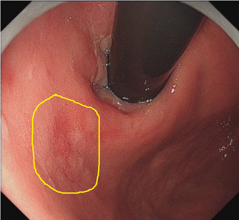 图:胃镜看到了一个早癌(黄圈内的范围)