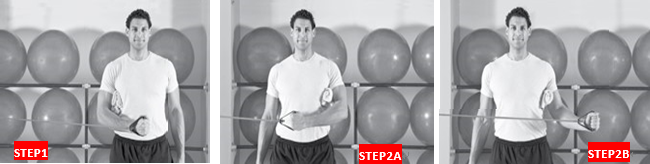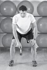 起始位置:笔直站立,双脚并拢。手握一个约重1千克的哑铃,哑铃的一端悬挂朝地。