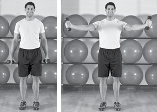 起始位置:笔直站立,双脚分开,与髋部同宽;双手各握1千克左右的哑铃,拇指向前。