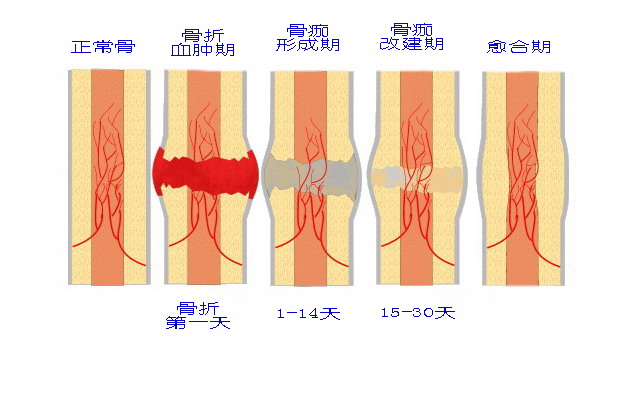 通常在伤后4~8小时,破裂的出血即可在两断端间形成血肿,24~72小时内血肿机化,骨折后1~2周机化的血块被纤维血管组织所替代,通过一些生长因子的作用,逐渐产生骨样组织和新骨,形成骨痂。接着是骨痂改建,恢复到和原来骨组织一样的结构,一般过程大约需8到12周完成(图4)。