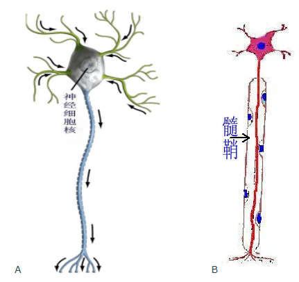 图2 A 一个神经细胞示意图   B 中央红色为神经细丝及包绕的髓鞘
