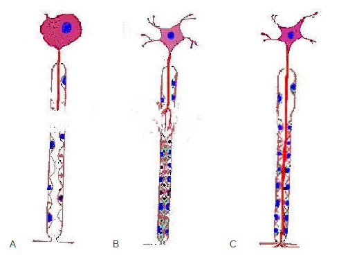 图3 A 一个神经纤维断离  B 髓鞘对位准确  C 中央的神经丝最终长入远端的髓鞘中