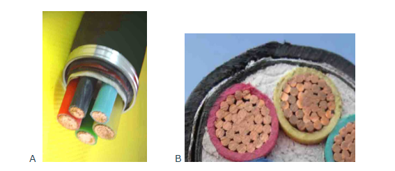 图6 A 一条粗电缆有几条细电缆组成  B 每条细电缆由许多细丝电线组成