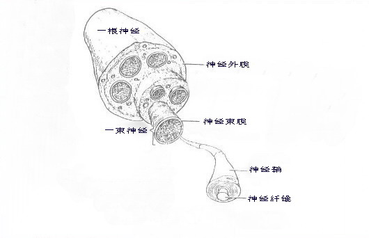 神经是有神经细胞组成的。神经细胞表面有许多短的接受信号的突起及一根长长的送出信号的神经纤维,称为“轴突”。 神经纤维信号的传导是一种“电信号”,如同电线传导一样。为了不使电信号发生“漏电”、“串线”,在每根神经纤维中央细丝周围包绕着一层厚厚的保护膜,称为“髓鞘”(图2)。